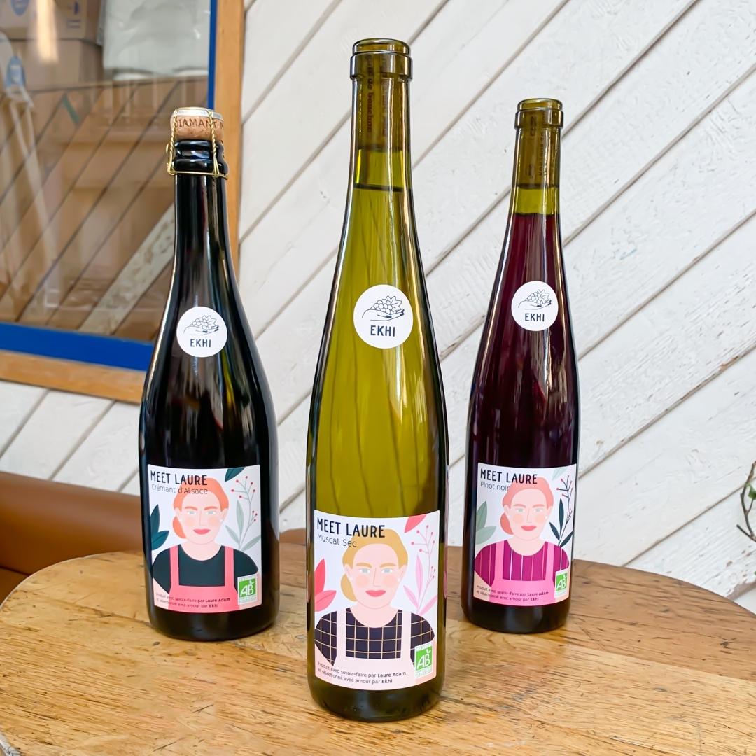 Honorine : Effectivement, à la fin du confinement, on a fait un petit tour de France afin de découvrir les vignobles. On s’est surtout baladées dans l’Est, car l’Alsace est une région que l’on chérit. On voulait y faire des cuvées, c’est un terroir riche que l’on aime beaucoup. On voulait aussi proposer des vins que l’on n’a pas l’habitude de trouver ou d’acheter, avec des cépages et des appellations plus ou moins connus. Dans notre sélection, on a un crémant d’Alsace qui est une AOC connue, mais on a aussi le muscat sec qui est un cépage plus confidentiel. En Alsace, on aurait plus pensé à un Riesling ou à un Gewurztraminer pour le blanc par exemple. Pour le rouge, on a choisi le Pinot noir, un cépage consommé et connu à l’étranger et un peu moins en France. On a voulu composer notre gamme de manière équilibrée en choisissant des valeurs sûres, mais aussi des vins à faire découvrir au consommateur pour le faire voyager en Alsace et bousculer ses habitudes.